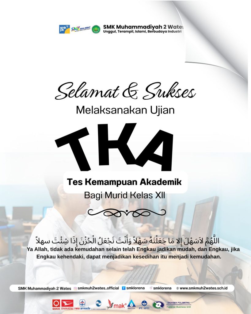 SMK Muhammadiyah 2 Wates melaksanakan Ujian Tes Kemampuan Akademik (TKA) pada tanggal 5–6 Oktober 2025 sebagai salah satu rangkaian kegiatan evaluasi akademik untuk mengukur kompetensi dan kesiapan peserta didik. Ujian dilaksanakan secara tertib dan terorganisir di lingkungan sekolah dengan memanfaatkan lima ruang ujian yang telah dipersiapkan sesuai standar serta dilengkapi fasilitas yang mendukung proses pelaksanaan tes.