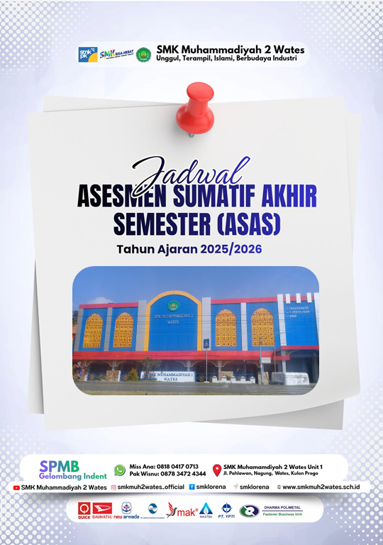 SMK Muhammadiyah 2 Wates melaksanakan Asesmen Sumatif Akhir Semester (ASAS) pada tanggal 26 November hingga 5 Desember. Kegiatan ini diikuti oleh seluruh peserta didik dari kelas X, XI, dan XII sebagai bentuk evaluasi pencapaian kompetensi selama satu semester.