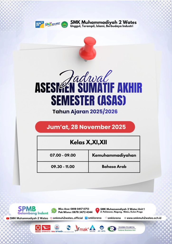 SMK Muhammadiyah 2 Wates melaksanakan Asesmen Sumatif Akhir Semester (ASAS) pada tanggal 26 November hingga 5 Desember. Kegiatan ini diikuti oleh seluruh peserta didik dari kelas X, XI, dan XII sebagai bentuk evaluasi pencapaian kompetensi selama satu semester.