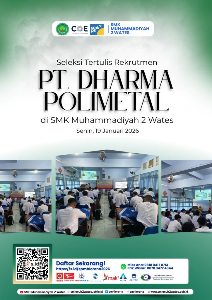 Sebanyak puluhan pelamar padati aula SMK Muhammadiyah 2 Wates dalam rangka mengikuti seleksi calon tenaga kerja PT Dharma Polimetal. Bursa Kerja Khusus (BKK) SMK Muhammadiyah 2 Wates bekerja sama dengan PT Dharma Polimetal kembali mengadakan rekruitmen tenaga Kerja. PT Dharma Polimetal merupakan sebuah perusahaan manufacturing berbasis metal yang tersebar di daerah Cikarang. Kerja sama antara pihak Dharma Polimetal dengan BKK SMK Muhammadiyah 2 Wates sudah sering mengadakan rekruitment di SMK Muhammadiyah 2 Wates.. “Alhamdulilah di seleksi banyak yang masuk dunia kerja dalam program pemagangan. Untuk seleksi kali ini diselenggarakan dalam satu sesi yaitu Psikotest dengan HRD PT Dharma Polimetal. Peserta yang mengikuti seleksi kali ini untuk meraih beberapa posisi kerja di PT Dharma Polimetal seperti teknisi dan Maintenance,”.