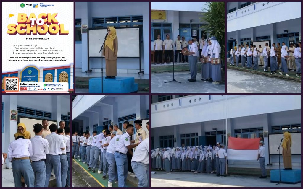 Senin, 30 Maret 2026 menjadi hari pertama masuk sekolah bagi seluruh siswa di SMK Muhammadiyah 2 Wates setelah libur. Kegiatan diawali dengan pelaksanaan upacara bendera yang berlangsung dengan tertib dan khidmat di halaman sekolah. Bertindak sebagai pembina upacara adalah Ibu Tri Handayani, S.Pd selaku Kepala Sekolah. Dalam amanatnya, beliau menyampaikan pentingnya kedisiplinan, semangat belajar, serta menjaga sikap dan karakter yang baik sebagai pelajar.